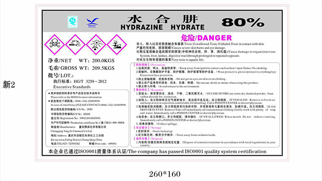水合肼(肼:拼音:jǐng)又稱水合聯氨。純品為無色透明的油狀液體,有淡氨味,在濕空氣中冒煙,具有強堿性和吸濕性。常壓下,肼可以和水形成共沸(共沸物中肼含量約為69%)[1] 。工業上一般應用含量為40%--80%的水合肼水溶液或肼的鹽。水合肼液體以二聚物形式存在,與水和乙醇混溶,不溶于乙醚氯仿;它能侵蝕玻璃、橡膠、皮革、軟木等,在高溫下分解成N2、NH3和H2;水合肼還原性極強,與鹵素、HNO3、KMnO4等激烈反應,在空氣中可吸收CO2,產生煙霧。水合肼及其衍生物產品在許多工業應用中得到廣泛的使用,用作還原劑抗氧劑,用于制取醫藥、發泡劑等。